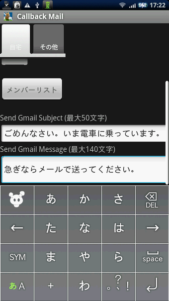 便利なのは、連絡先に設定されたカテゴリー毎に、それぞれ異なる文面を送れる点です。連絡先のカテゴリー名はCallback Mailに表示されるタブにも反映され、タブを切り替えることで、カテゴリー毎に違う文面を設定できます。例えば「自宅」と「仕事」でカテゴリーを設定しておくと、プライベートと仕事で別々のメール文面を用意できます。個人の携帯電話を仕事でも使う人にとって、有難いところではないでしょうか。